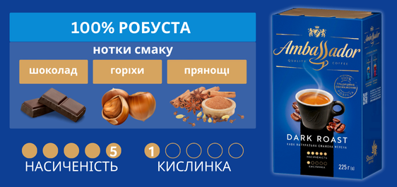 Кава 225 г Ambassador Dark Roast натуральна смажена мелена м/уп: доставка додому по Україні