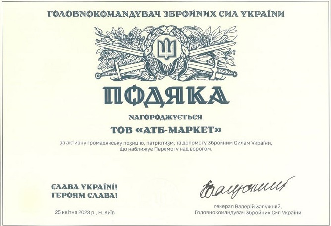 Акція «Сертифікат для допомоги ЗСУ та медичним закладам країни » розпочалася 24 лютого до річниці початку повномасштабного вторгнення ворога і тривала дев'яносто днів. Вона проходила на базі усіх супермаркетів мережі «АТБ» (станом на сьогодні працюють 1 185 магазинів) у різних куточках України та об’єднала майже мільйон громадян. Протягом зазначеного часу кожен охочий мав можливість зробити особистий внесок у наближення перемоги. Для цього потрібно було придбати зі спеціальних промостійок або у прикасових зонах дискаунтерів найбільшої вітчизняної торговельної мережі благодійний сертифікат номіналом 30 грн., 50 грн. або 100 грн. На підтвердження такого патріотичного вчинку покупці отримували відповідну сувенірну наліпку — «Сертифікат для ЗСУ» чи «Сертифікат для медичних закладів».